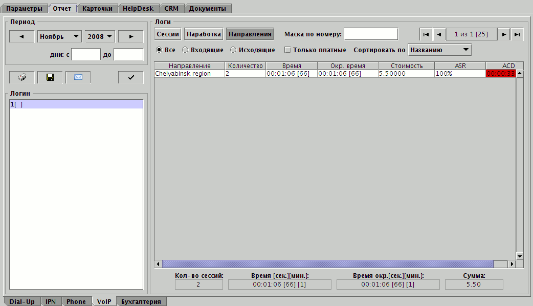 Отчет по направлениям показывает наработку выбранных логинов в разрезе конечных пунктов звонка (направлений), либо исходящих пунктов звонка для входящих звонков. Чтобы посмотреть все звонки логина по данному направлению, получите отчёт по направлениям и дважды кликните по строке с интересующим вас направлением. Будет выдан отчёт по сессиям с сессиями только по этому направлению.