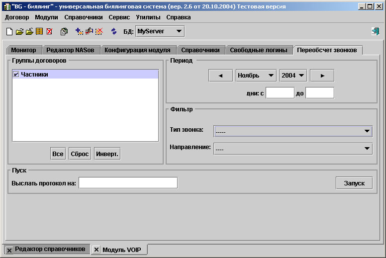 Данная возможность используется для пересчёта сессий задним числом. Например, при неверно указанных ценах. Для пересчёта сессий зайдите на вкладку , затем выберите группы договоров, чьи сессии нужно переобсчитать, типы звонков и т.п.