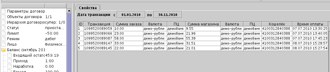 В параметрах договора можно посмотреть все платежи и их параметры.