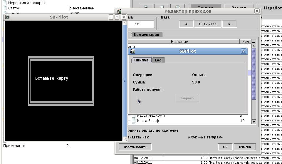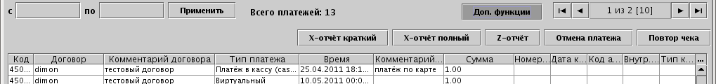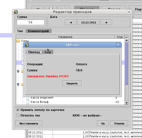 На второй вкладке "Log" можно увидеть более подробную информацию о взаимодействии с утилитой. Если работа была завершена с ошибкой, то платёж не совершается и мы по-прежнему имеем дело с диалогом добавления платежа. Если оплата проведена успешно, то платёж совершается, диалог закрывается, в историю платежей заносится запись. В истории платежей () также имеется возможность совершения дополнительных действий - отмены, повторы, некоторые отчёты итп.