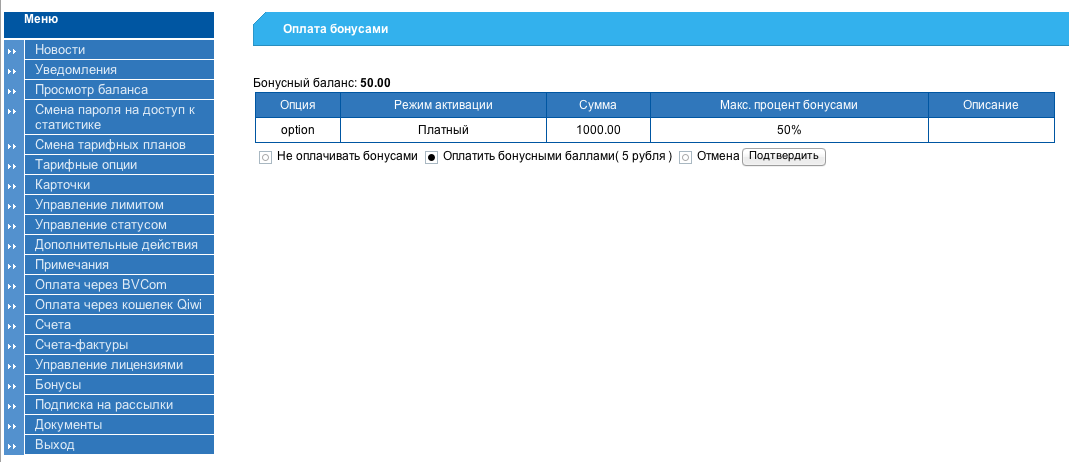 Для активации тарифных опций с использованием бонусов необходимо в тарифных опциях нажать на кнопку и, если тарифная опция не является бесплатной и бонусный баланс больше 0, то произойдет переход на страницу, где пользователю будет предложено оплатить часть расхода бонусами. Причем пользователю будет предложена максимально возможная сумма для оплаты бонусами, которая зависит от бонусного баланса и максимального процента для данного расхода.