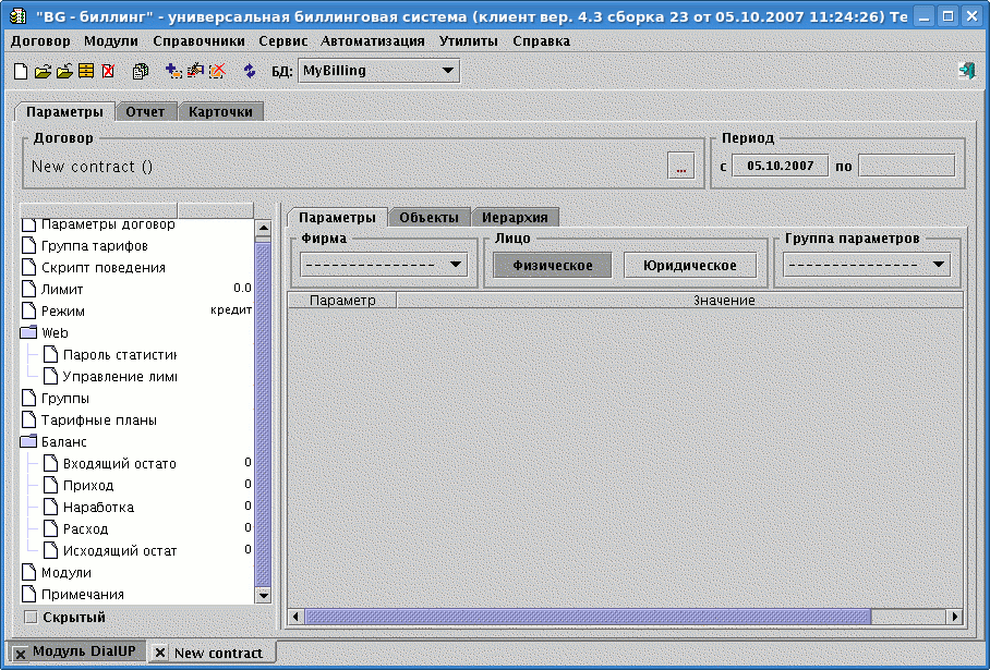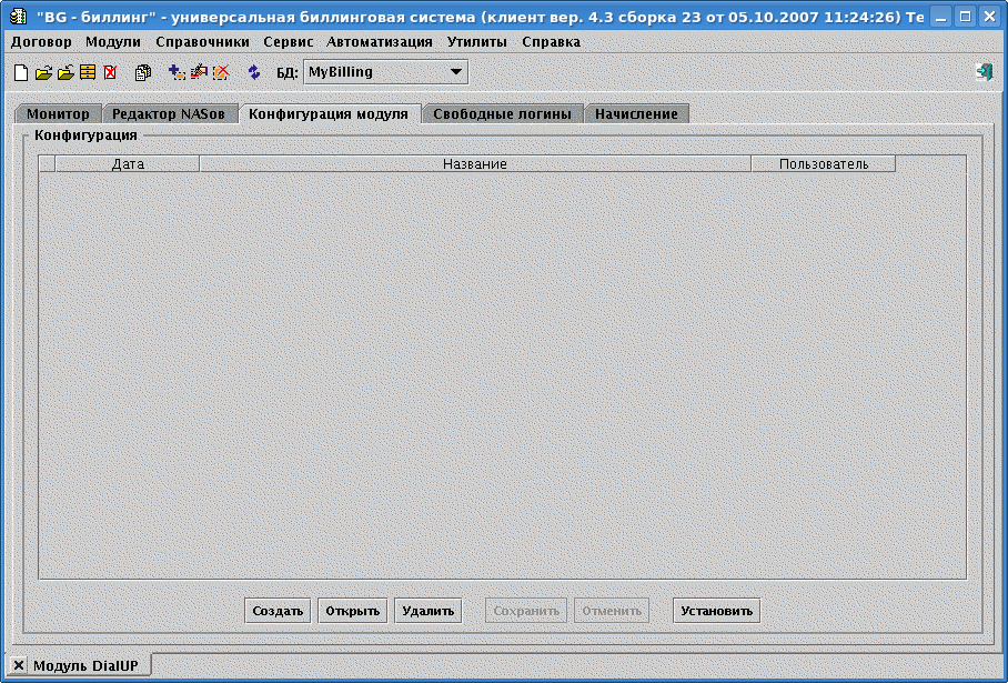 Здесь задаются настройки, специфичные для данного модуля и его агентов (например, RADIUS-сервера модуля DialUp). Конфигурация сохраняется в БД и поэтому доступна всем серверным компонентам биллинговой системы.