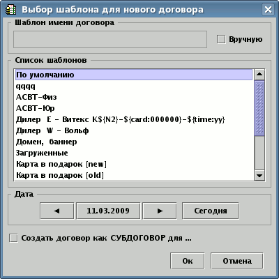 Для примера создадим договор (New Contract) с шаблоном по умолчанию (более подробно о договорах, их свойствах и шаблонах см. далее). Для этого нажмём кнопку на панели инструментов (самая левая кнопка), далее выберем шаблон и текущую дату.