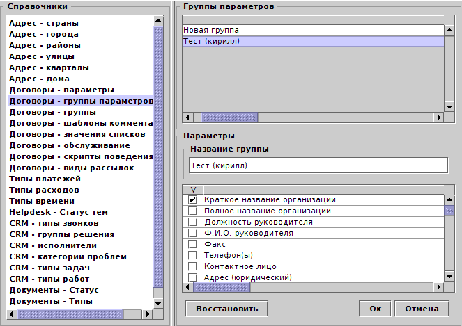 Иногда для разных групп договоров существуют параметры, которые не совпадают друг с другом. Так, для договора на частное лицо параметр "Юр. адрес" не имеет смысла. Чтобы при редактировании договора отображались только нужные параметры, следует создать группу параметров и в привязке параметров указать необходимый набор атрибутов.