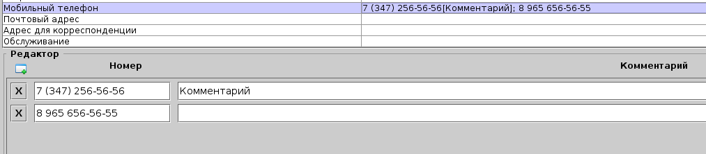Параметр договора Телефон может содержать неограниченное кол-во номеров телефонов. Формат результирующей строки (отображается в списке параметров договоров) состоит из формата номера и комментария в квадратных скобках (если комментарий не пустой). Формат номера задается в конфигурации сервера (по желанию), либо используются значение по умолчанию - все цифры телефона без пробелов и иных символов.