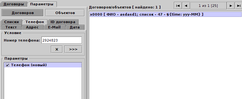 Для поиска по параметру Телефон необходимо указать номер телефона, а также сам параметр типа Телефон, по которому будет производится поиск.