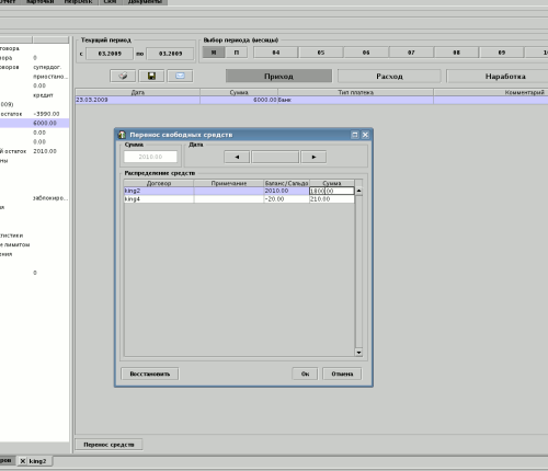 В зависимости от режима баланса супердоговора и независимых субдоговоров при оценке задолженности берется либо баланс, либо сальдо. Распределение наработки может быть произведено и после занесения прихода оператором биллинга путем нажатия кнопки в любой из панелей баланса договора.