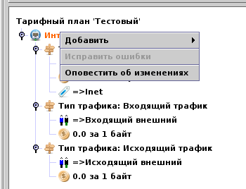 В модулях Inet, NPay кэшированное в памяти тарифицирующего приложения дерево не перечитывается до тех пор, пока не будет передано событие. Событие передаётся выбором пункта в корневом узле модульного подерева. О внесённых в поддерево изменениях сигнализирует оранжевый цвет корневого узла.