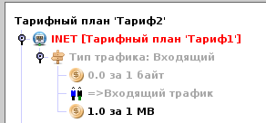 Узлы дерева-предка всегда выделены серым цветом и недоступны для редактирования. Узлы дерева-потомка всегда располагаются после узлов предка. Так же они обрабатывают позже тарифный запрос. При этом они могут перетирать значения параметров ответа тарифного запроса, установленные предыдущим узлом предком. Например, в предыдущем примере при использовании тарифа "Тариф2" стоимость мегабайта типа трафика "Входящий" будет стоить 1 рубль.