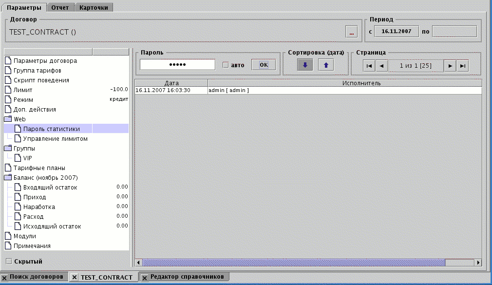 По умолчанию клиентам разрешена авторизация по номеру договора и паролю статистики, пароль статистики изменяется на вкладке договора. Для смены пароля наберите его в текстовой области, либо установите галочку и нажмите .