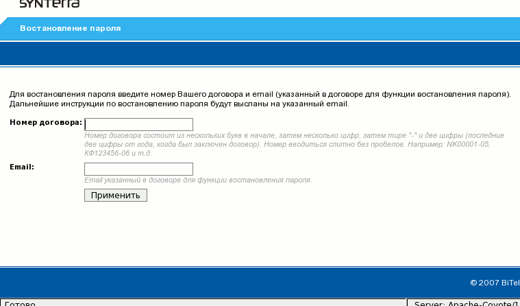 В поле пользователь должен ввести номер своего договора, а в поле E-mail - почтовый адрес, который должен совпасть со значением текстового параметра договора, содержащим E-Mail-адрес для восстановления пароля. Код этого параметра указывается в конфигурации сервера биллинга =<числовой код параметра>.