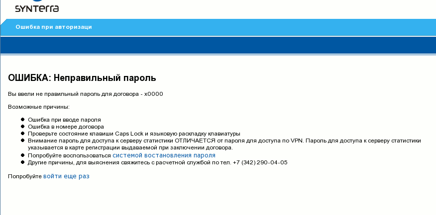 При ошибке авторизации отображается страница, задаваемая шаблоном . Скорректируйте в данном шабkоне номер телефона вашей техподдержки. Если вы используете дополнительные режимы авторизации кроме договора, скорректируйте выводимый текст.