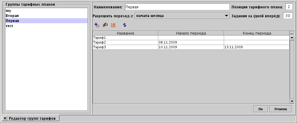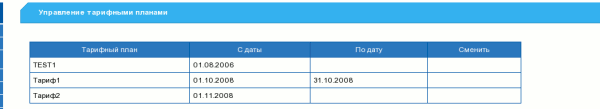 Также обратите внимание, что для каждого тарифа может устанавливаться начальная и/или конечная даты периода, когда эти тарифы видны в Web-интерфейсе пользователя и доступны для выбора. Это дополнительное средство обеспечения гибкости. Можно, например, сделать доступными некоторые из тарифов группы через некоторое время. Но это не имеет никакого отношения к возможности установки на какое-то число начала действия тарифа. Это только период, когда тарифы видны в списке выбора тарифов для смены.