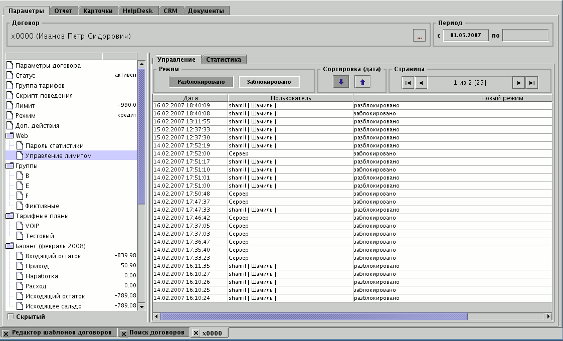 Оператор биллинга может индивидуально управлять доступом договора к сервису временного понижения лимита через вкладку договора.