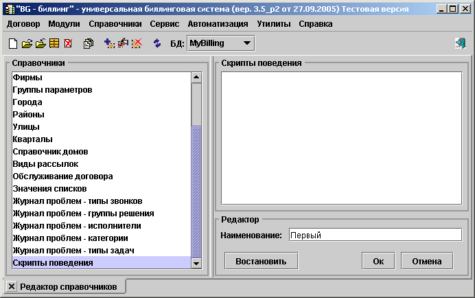 В меню Сервис=>Автоматизация=>Скрипты поведения производится привязка к скрипту поведения его функций. Оно содержит две вкладки: Скрипты BGBS и Классы Java.