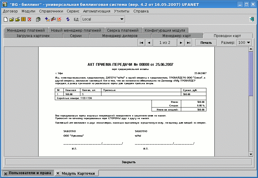 В таблице возможна установка фильтров по типу проводки (выдача/возврат) и по дилеру. Колонка формируется с вычетом скидки, указанной в свойствах дилера. При просмотре проводки формируются Акт передачи/возврата и Заявка на выдачу/возврат карт.