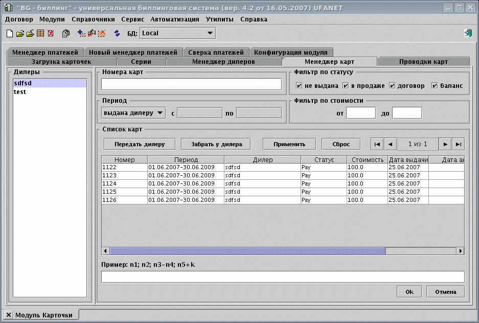 При передаче карт можно указать как количество карт выдаваемое из каждой серии (отображаются только не пустые серии), так и перечислить серийные номера карточек. При перечислении можно использовать следующие конструкции, разделённые точкой с запятой: