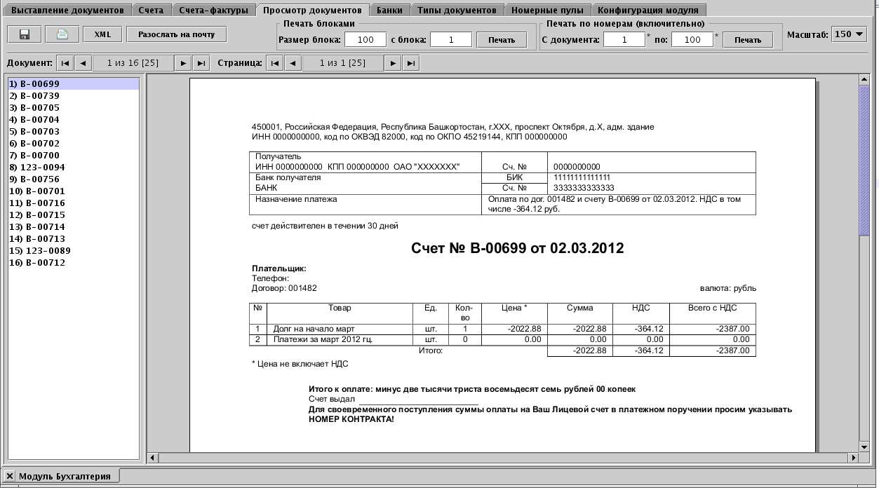 Элемент управления в верхней части окна позволяет перелистывать документы. Список документов также находится в левой части окна просмотра и позволяет быстро перейти к нужному документу. Следующий элемент - перелистывание страниц в пределах одного документа. Кнопка позволяет просмотреть исходный XML-документ, на основании которого генерируется печатная форма. Этот режим полезен при модификации и отладке XSLT-шаблонов для генерации печатных форм (см. далее). Возврат в режим просмотра печатной формы осуществляется повторным нажатием кнопки . По нажатию на кнопку происходит добавление задачи в планировщик «Задача рассылки документов с компоновкой». В этом режиме для отправки документа e-mail берется из конфигурации модуля. Отправляются все документы, добавленные в просмотрщик, по всем договорам, у которых они добавлены.