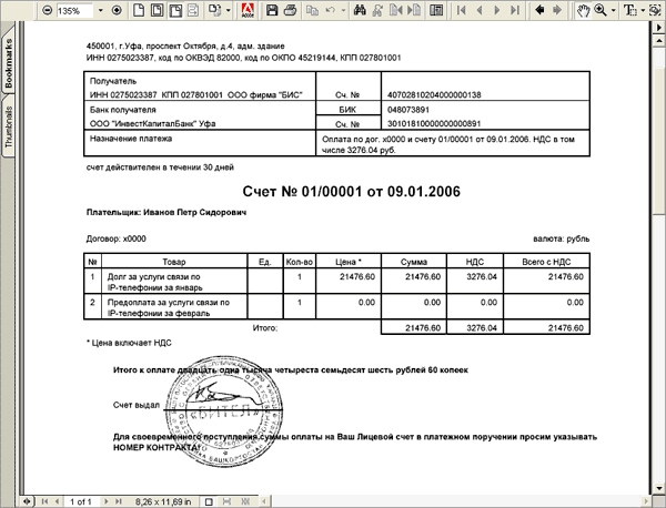 Нажав на ссылку , пользователь получит готовый для распечатки счёт в виде PDF-документа: