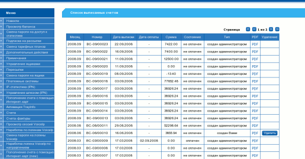 В личном кабинете пользователь может просматривать счета и счет-фактуры в пунктах меню и (названия пунктов меню могут быть изменены в конфигурации модуля). Отображаются все документы договора в режиме обратной сортировки по месяцу, за который они были выписаны.