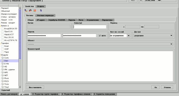 В основных свойствах установите период действия логина, алиас (по необходимости), ограничение по числу сессий (обязательно при выдаче статических адресов), пароль (галочка позволяет сгенерировать пароль автоматически длиной, заданной переменной в конфигурации модуля и набором символов из переменной ).