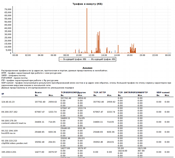 Стандартная детализация за сессию представляет из себя одно или несколько писем с приложенным архивом detail.zip. Архив содержит CSV-файл с частью детализации. Размер максимального возможного detail.zip в одном письме задается переменной в файле netflow_ipn.properties. По умолчанию значение переменной составляет 4000000 байт. Каждое письмо сопровождается темой , где N - увеличивающийся порядковый номер. Последнее письмо данной детализации снабжено темой и содержит простейшую аналитику: на какие и с каких адресов был максимальный трафик.