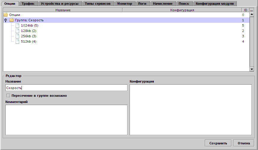 По умолчанию при прохождении тарифного дерева указанные опции просто добавляются в набор, однако, если опции выделить в отдельную группу и оставить поле "Пересечение в группе возможно", то установка очередной опции из группы удалит все другие опции из той же группы. Такую группу, например, можно создать для указания скоростей - тогда при использовании тарифных веток диапазонов (а при тарификации возможна ситуация, когда запрос зайдёт сначала в одну ветку диапазона, заполнив её, а затем в следующую, т.к. есть остаток), опция скорости в итоге всегда будет одна - последняя установленная при прохождении тарифа.