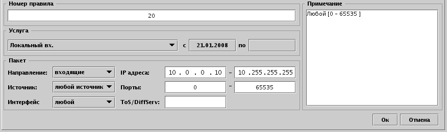 Для примера работы правил рассмотрим сеть с выделенным почтовым сервером 10.0.0.10, локальной сетью 10.x.x.x и внешним интернетом через, например, NAT. Трафик входящий из внешнего интернета и с почтового сервера следует отнести к внешнему, а трафик с локальной сети - к внутреннему. Последовательно отображены редакторы добавления правил.