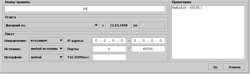 Также возможно делить трафик на услуги используя . Для этого в правиле необходимо прописать значение вида 000.000.00, т.е. 8 бит, для каждого бита 1, 0 или x - любой. Например, 000.100.xx или 000.1x0.xx. 000.1x0.xx преобразуется в 000.100.00 и маску 111.101.00б сначала наложится маска, результат проверится на соответствие с 000.100.00. Если использовать DiffServ не нужно, просто оставьте поле пустым.