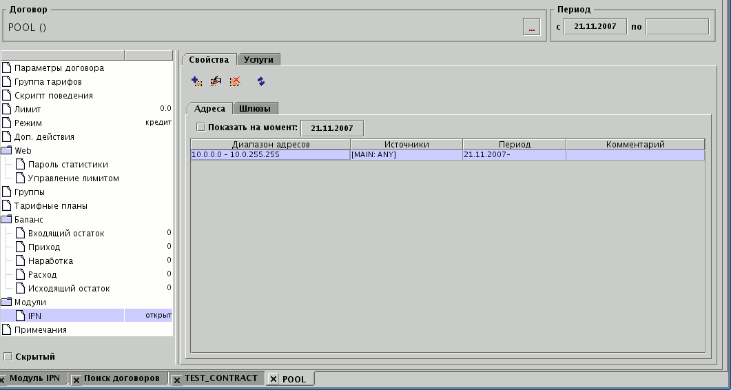 Подключение модуля IPN к договору осуществляется путем выбора узла дерева договора и нажатием кнопки стандартной панели иструментов.