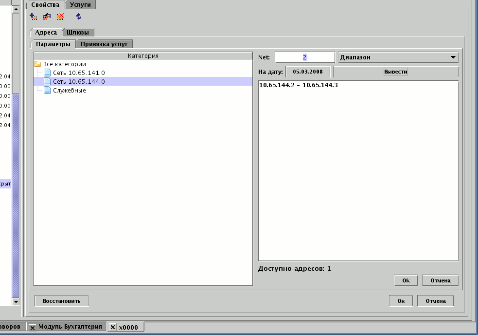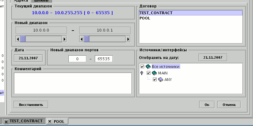 Для переноса одного или нескольких адресов с договора-пула на договор абонента выбирается строка с диапазоном и производится двойной клик мышью при нажатой клавише Ctrl. Адрес может быть перенесён только на один из открытых договоров. При переносе указывается источник и интерфейс, к которому относится абонент, а также дата, с которой адрес переходит новому договору