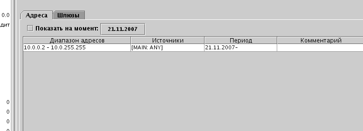В случае, если абонент идентифицируется не по адресу, а по интерфейсу, необходимо выбрать интерфейс в дереве, а диапазон адресов установить в 0.0.0.0-255.255.255.255. Интерфейс с зоной должен быть предварительно создан на вкладке модуля.