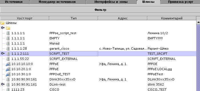 Здесь можно фильтровать шлюзы по хосту, типу, коментарию и адресу .