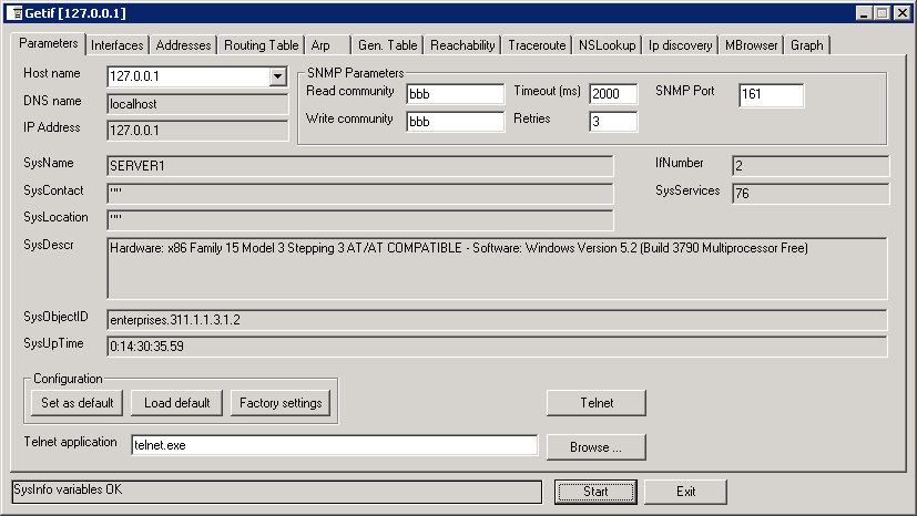 Определения существующих интерфейсов установите в первой вкладке имя community и адрес хоста, соединитесь.