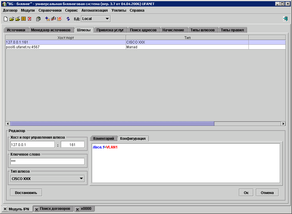 Теперь при добавлении шлюза в договор после выбора шлюза 127.0.0.1 отобразится следующий редактор.