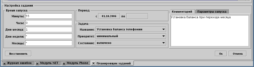 Соответственно, необходимо настроить два экземпляра задачи в планировщике заданий. Одну - периодическую, например, каждый час. Другую - в 55 минут первого часа месяца для установки баланса за предыдущий месяц с учётом последнего загруженного часового лога. Примеры настройки периодической и единоразовой задач приведены на снимках ниже.
