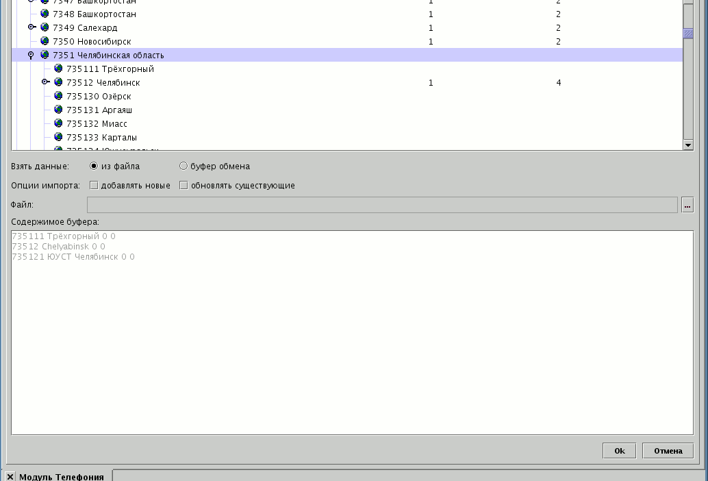 Справочник географических кодов - это перечень записей вида "префикс-направление", описывающий весь мир. Пример справочника можно загрузить здесь. Перед началом работы с модулем необходимо произвести загрузку справочника на вкладке модуля .