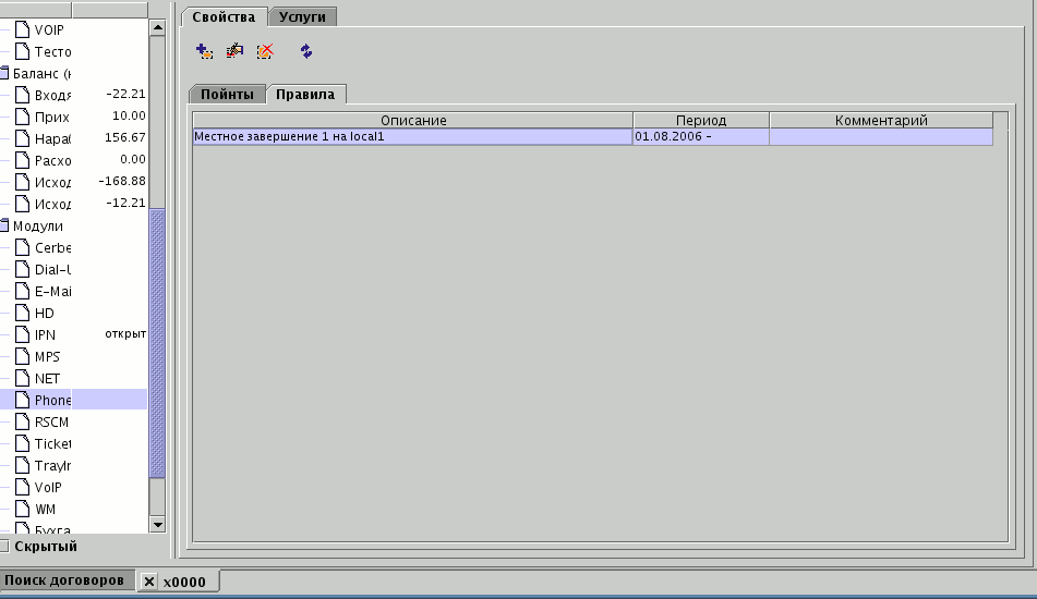 Для подключения модуля телефонии в договор добавьте одну или несколько услуг модуля к договору. Для модуля телефонии в данный момент наличие той или иной услуги модуля в договоре кроме подключения модуля к договору не означает.