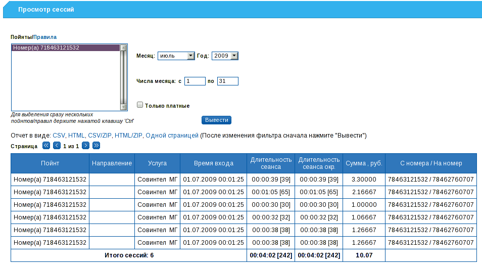 Для просмотра наработки по телефонии нужно выбрать поинты/правила, указать период. Если необходимо вывести только платные сессии, то нужно поставить галочку. Отчет по данному пункту можно загрузить с этой страницы, нажав на формат, в котором будет сформирован отчет.