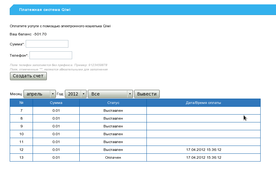 Над таблицей с историей платежей расположена форма для совершения нового платежа. Чтобы осуществить платеж, необходимо заполнить обязательные поля и . Далее необходимо нажать кнопку и подтвердить создание счета. После подтверждения клиент попадает на страницу системы Qiwi, где ему необходимо авторизоваться и подтвердить созданный счет с помощью своего мобильного телефона.