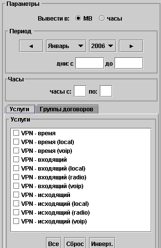 Выводит наработку договоров по выбранным услугам в часах, либо мегабайтах.