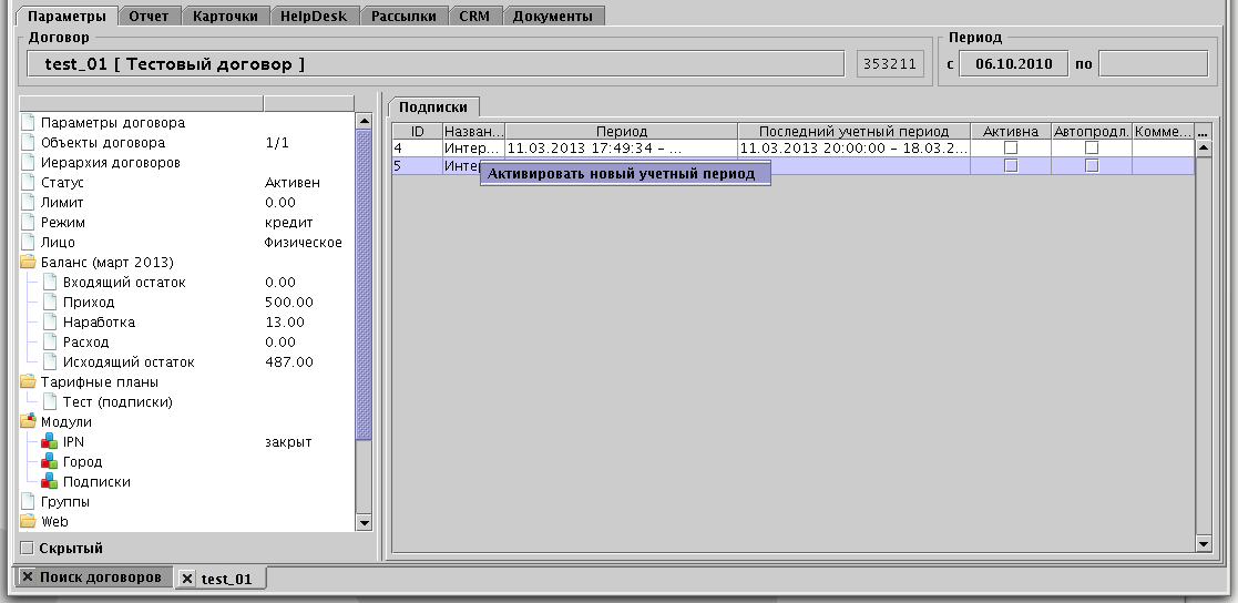 После добавления подписки на договор, подписку необходимо активировать, для этого выбираем подписку из списка в договоре, правой клавишей мыши вызываем контекстное меню и из выпадающего меню выбираем "Активировать новый учетный период". Активация происходит только при условие, что на договоре есть необходимая для активации сумма и услуга прописана в тарифном плане.