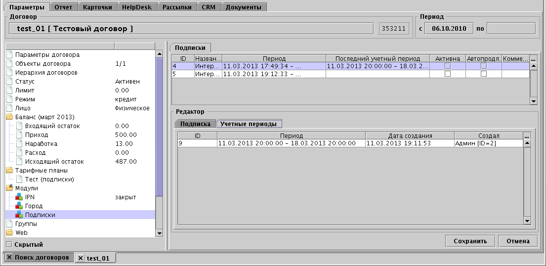 При удачной активации в списке подписок в столбце "Последний учетный период" отображается период на который подписка активирована. По окончании этого периода система попытается повторно активировать новый учетный период, при условии, что на договоре достаточно средств и стоит флаг автопродления. Если флаг автопродления включен, а средств не достаточно, активация будет приостановлена до прихода на договор средств достаточных для активации подписки. Новый период не будет активирован если период действия "Типа подписки" или период подписки на договоре заканчивается раньше, чем период подписки.