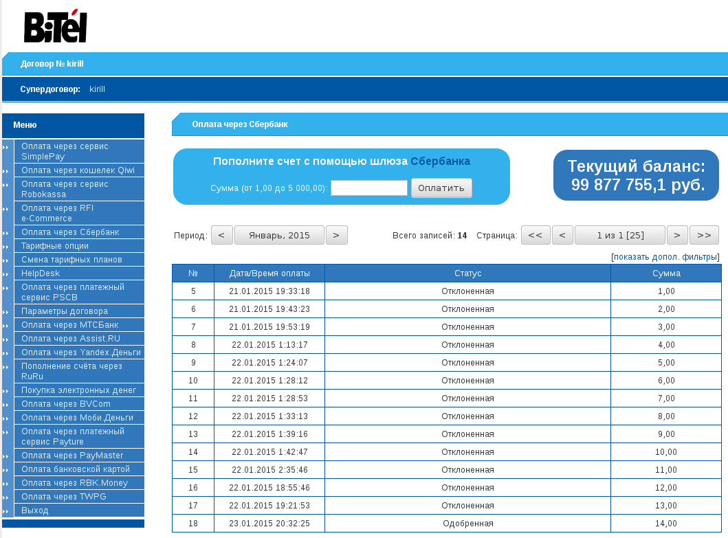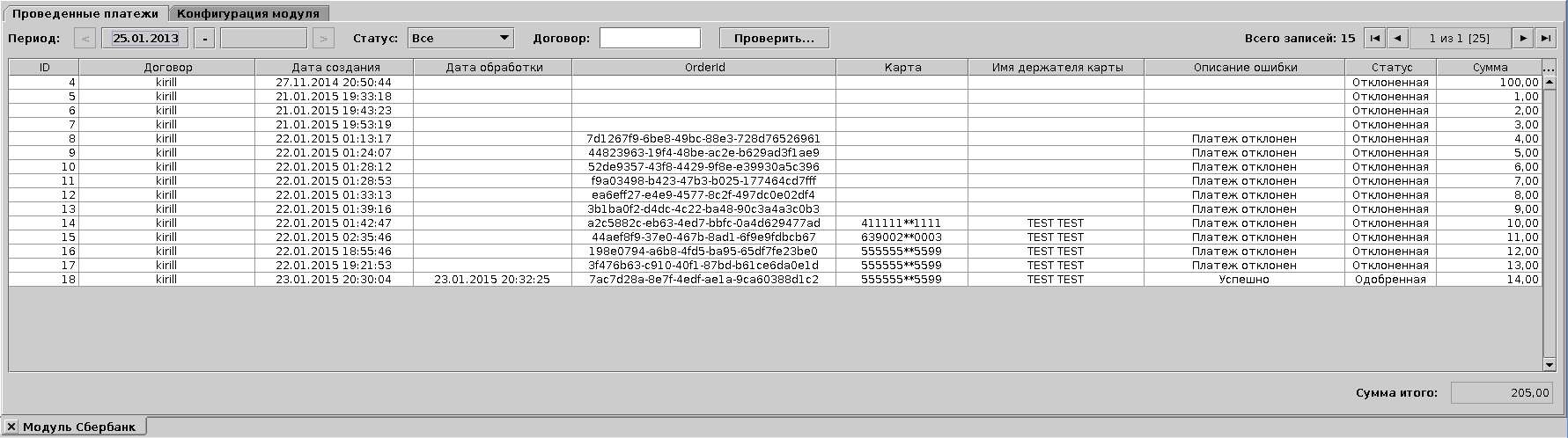 Для просмотра общего списка платежей по всем договорам в системе существует Монитор транзакций, который доступен через меню Sberbank .