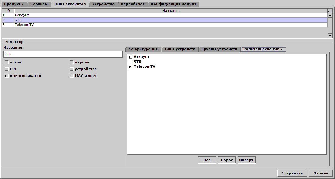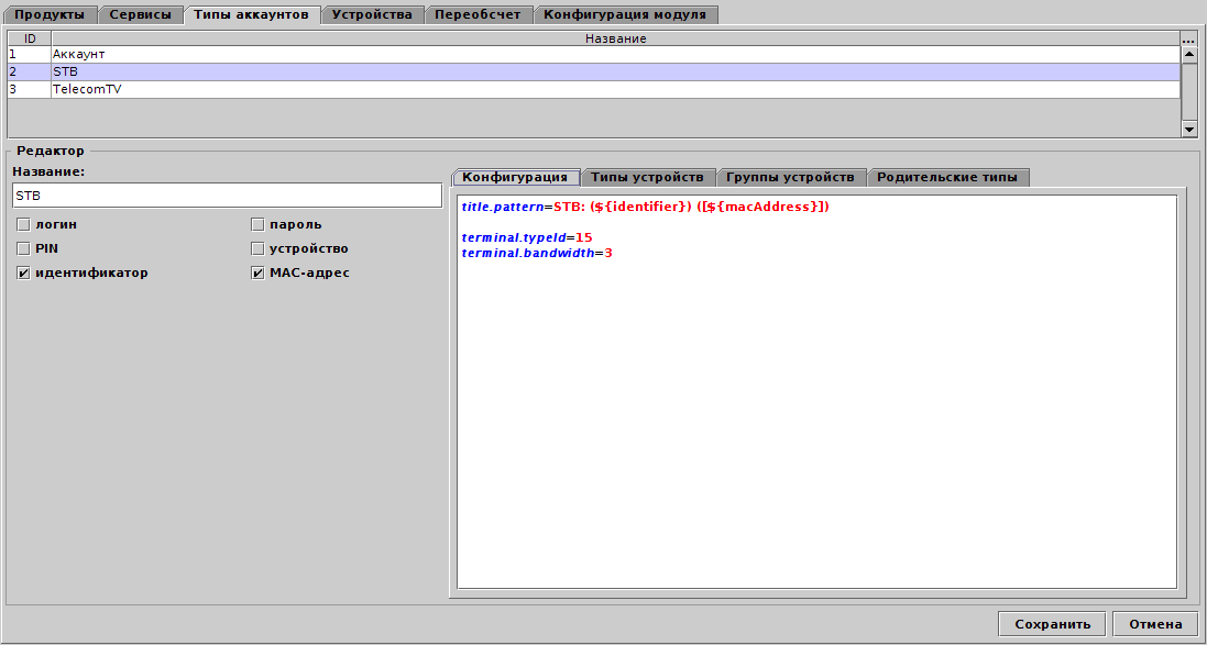 Для каждого типа STB может быть свой тип аккаунта, например, с различной конфигурацией. Пример типа аккаунта описывающего STB-приставку: