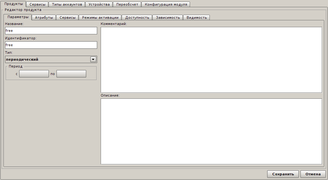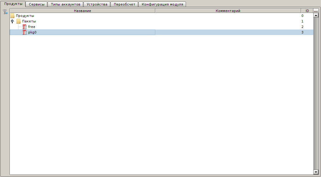 Теперь необходимо создать Продукты - они будут отражать пакеты системы IPTVPortal. Поле Название - это название, с которым данный продукт будет отображаться в биллинге. Поле Идентификатор - идентификатор пакета системы IPTVPortal (по умолчанию обычно free, pkg0, pkg1, pkg2...).
