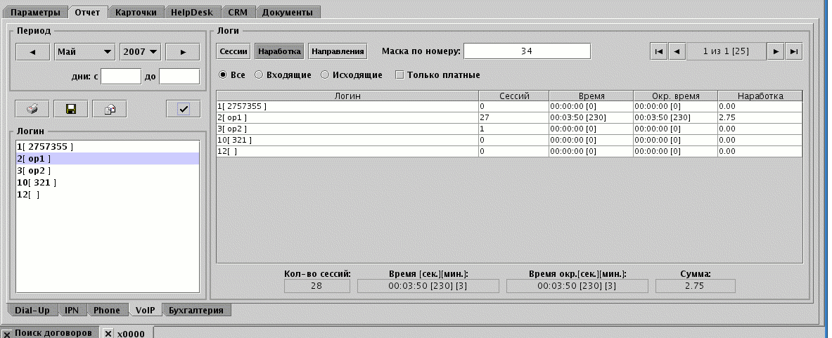 Для получения отчёта по сессиям - выберите один или несколько логинов и нажмите кнопку вывода отчёта (галочка). Отображаются только те логины, период которых пересекается с указанным для поиска периодом. Дополнительно можно установить фильтр по номеру звонящего, при этом будут выведены только звонки, где в номере звонящего есть указанная подстрока. Также можно установить фильтр для вывода только платных звонков, только входящих, либо только исходящих. Двойной клик мышью в строке отчёта по сессиям показывает RADIUS-лог по текущей сессии.