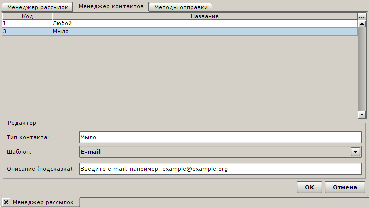 Для создания нового типа контакта необходимо указать его название, описание (которое будет видно пользователям) и регулярное выражение (шаблон), которым будет проверяться валидность введённых данных. Существует ряд предустановленных шаблонов типов контактов, это: