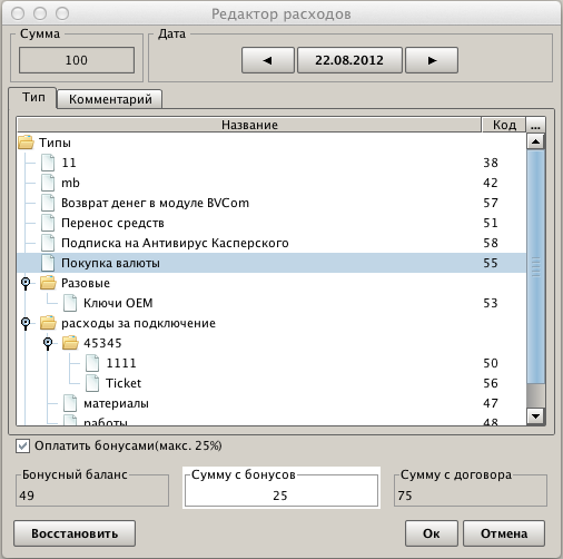 Бонусные расходы создаются только при создании расходов для договора. В клиенте для этого создается расход на некоторую сумму и выбирается пункт "" ( в скобках указывается максимальный процент от суммы расхода, который можно оплатить бонусами, который, в свою очередь, устанавливается в настройках плагина). После чего вводится сумма, которая будет оплачена бонусами. Данный пункт будет только при условии, что плагин включен у договора.